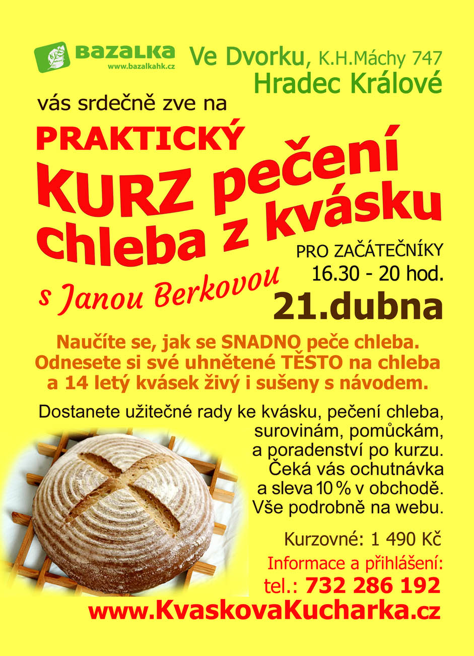 PRAKTICKÝ KURZ PEČENÍ CHLEBA Z KVÁSKU V ÚTERÝ 21. DUBNA 2026 od 16:30 do Bazalky Ve Dvorku.